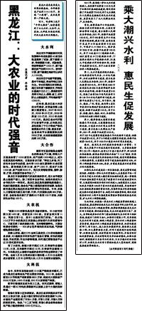 產(chǎn)量連年增》、《黑龍江:大農(nóng)業(yè)的時(shí)代強(qiáng)音》、《河南:強(qiáng)基礎(chǔ)提升抗災(zāi)能力》等多篇關(guān)注“三農(nóng)”報(bào)道,對水利保障糧食“八連增”作了重點(diǎn)報(bào)道。五版以《興水惠民畫卷強(qiáng)勁展開》為主打稿,整版推出水利宣傳專題,并在同期開設(shè)“水利改革發(fā)展看地方”專欄。八版推出《乘大潮興水利