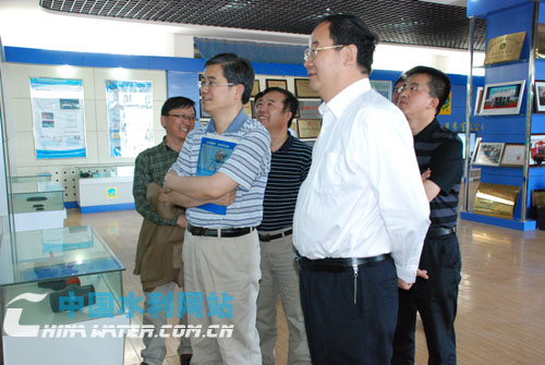 大禹節(jié)水集團(tuán)公司董事長王棟(前排右一)陪同中國工程院院士、中國農(nóng)業(yè)水問題研究中心主任、中國農(nóng)業(yè)大學(xué)教授康紹忠(前排右二)參觀公司展廳
