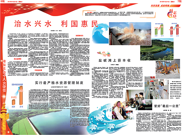 10月14日,《經(jīng)濟(jì)日?qǐng)?bào)》在“迎接黨的十八大”特刊中,以6、7版通版形式推出水利專題報(bào)道,全方位、多角度展示了黨的十六大特別是十七大以來,水利改革發(fā)展取得的輝煌成就,特刊既有文字報(bào)道,又有圖片圖表,圖文并茂,形式豐富,F(xiàn)將特刊展示如下: