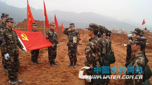 中國水利網(wǎng)站12月25日訊 (通訊員 徐迎華 趙洪虎) 哪里最危險(xiǎn),黨員就沖向哪里;哪里最需要,黨員就出現(xiàn)在哪里。12月24日,在深圳光明新區(qū)滑坡災(zāi)害救援現(xiàn)場,武警水電二總隊(duì)四支隊(duì)官兵面對鮮紅的黨旗,舉起自己緊握的右手,重溫入黨誓詞,決心繼續(xù)發(fā)揚(yáng)攻堅(jiān)克難,敢打必勝的鐵軍精神,堅(jiān)決打贏這場搶險(xiǎn)救援硬仗。宣誓結(jié)束后,他們又立即投入到緊張的生命救援行動中。