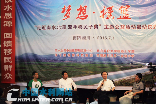 中國水利網(wǎng)站7月4日訊 (通訊員 張存有)“我的夢想是南水北調(diào)移民生活更幸福,能用上無人駕駛的巡邏車,監(jiān)視庫區(qū)水質(zhì),實(shí)現(xiàn)一渠清水永續(xù)北送,那移民付出是值得的!边@是7月1日“夢想?搖籃——走近南水北調(diào)、牽手移民子弟”主題公益活動(dòng)啟動(dòng)儀式上,淅川縣第一高級中學(xué)3年11班姬建訓(xùn)表達(dá)的愿望。淅川縣移民應(yīng)屆高中畢業(yè)生和第一高級中學(xué)近200余人,與來自千里之外的南水北調(diào)中線建管局宣傳中心、北京聯(lián)合大學(xué)機(jī)器人學(xué)院、保千里視像科技集團(tuán)等單位代表,面對面地溝通交流,暢談交流青春夢想。