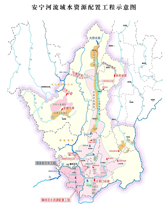 “安寧河流域水資源配置工程”由18個(gè)大中型水利項(xiàng)目組成,分為“輸水通道型”“結(jié)點(diǎn)水庫(kù)型”兩類(lèi)。具體包括大橋水庫(kù)灌區(qū)二期、龍?zhí)了畮?kù)及灌區(qū)、大橋水庫(kù)引水、大竹河水庫(kù)、和平水庫(kù)、竹壽水庫(kù)擴(kuò)建、米市水庫(kù)、攀枝花水資源配置、引雅...