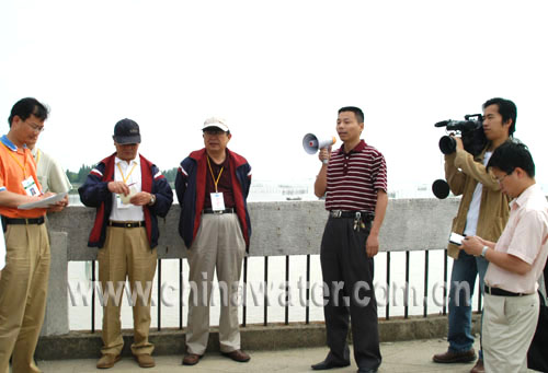 記者團在湖州太湖入湖口長兜港現(xiàn)場采訪