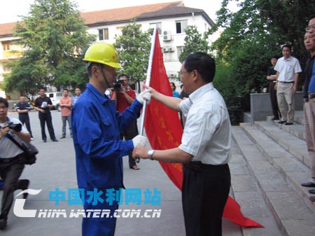 漢江集團總經(jīng)理賀平向搶險隊隊長楊林同志授隊旗 葉金華 攝