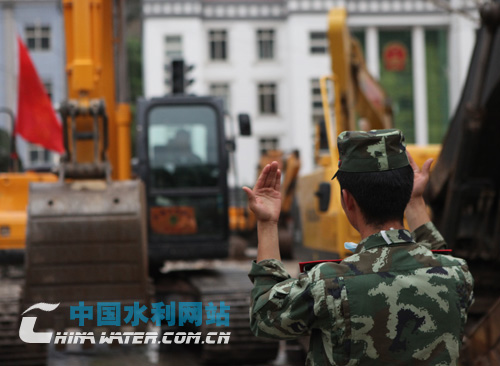 武警水電戰(zhàn)士指揮挖掘車入位