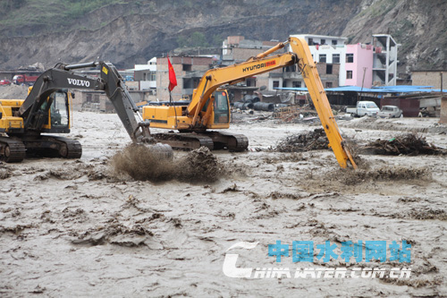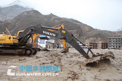 瓦廠橋泄流口,施工機械正將上游泥石挖送到下游