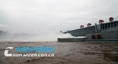 中國水利網(wǎng)站訊(記者 胡爭上)三峽大壩,一派寧靜,站在大壩上會聽到如火車穿過隧道般的轟鳴,8個深孔正以43000立方米每秒的流量泄洪,江水似巨龍奔騰,在夜晚的燈光映照下,散出一片黃中帶紫的輕霧。7月24日晚8時許,入庫洪峰流量71200立方米每秒的今年長江4號洪峰安然通過三峽大壩。