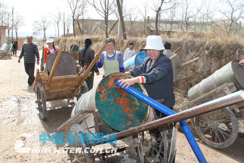 慶陽(yáng)市群眾等待抗旱服務(wù)隊(duì)送水