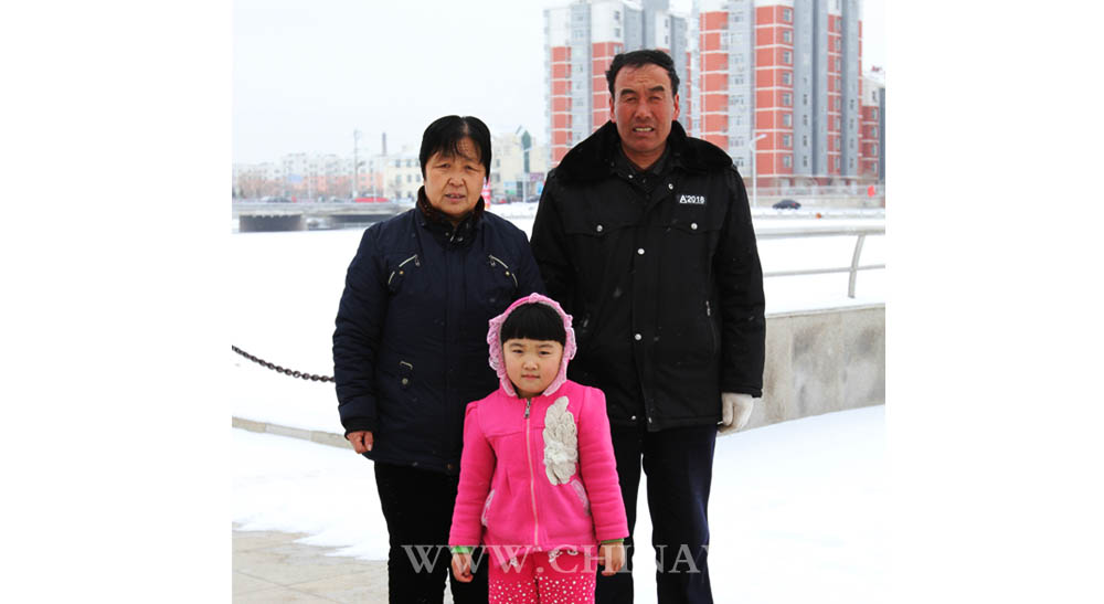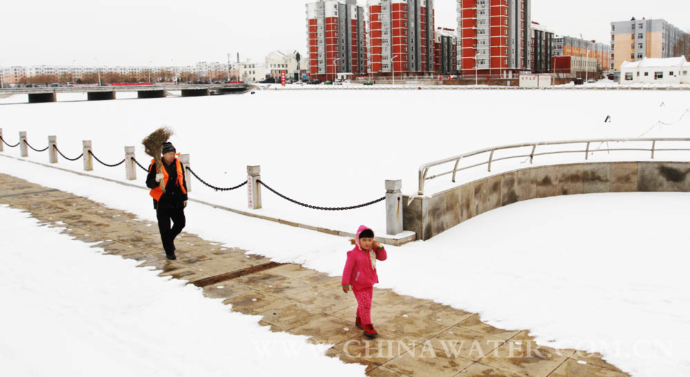 2月16日早晨,內(nèi)蒙古敖漢旗孟克河銀河公園橡膠壩54歲的管理員邵云祥一大早帶著小孫女,將河兩岸的人行道掃出一條小路,迎接游人的到來(lái)。(特約記者:張國(guó)鋒)