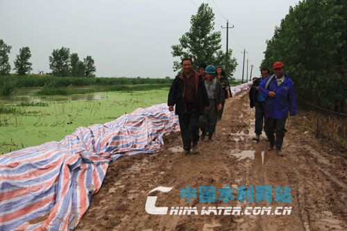 在小圩堤四閘,記者見到青泥湖辦事處辦公室主任周少龍,一臉的倦容,頭發(fā)早已被雨水打濕,他正在查看水位情況。這里湖面開闊,水面上籠罩著一層薄霧,暴漲的水位已經(jīng)把水位尺完全淹沒,“這里的水位尺最高的刻度是16.50米,現(xiàn)在已經(jīng)在水面下了!敝苤魅紊嫠畯澭鼘⑹直凵爝M(jìn)湖水里,通過他的手,記者才依稀看到水位尺頂端的印記。周主任又帶記者來到朱圩電排站,門口整理碼放著彩條布、編織袋等備汛物料。電排站附近的水位差不多與河堤齊平,“青泥湖辦事處小圩堤長(zhǎng)度有6700余米,這里的堤身都比較低,堤頂高程平均不足16.50米,東西兩側(cè)最低處的都不足16米,F(xiàn)在水位16.72米,可以說很多地方水位都已經(jīng)高過堤壩的頂端了,而且大部分田地的地勢(shì)都比堤壩低了很多,一旦洪水漫灌進(jìn)來,就會(huì)造成損失。所以我們對(duì)一些河道加固子堤,防止洪水漫堤!表樦苤魅问种傅姆较蛲ィd延三公里的堤壩鄰水側(cè)已經(jīng)壘起一條高度二十厘米左右的土方,都用彩條布覆蓋裹好,并用石塊壓住使其固定。除了洪水漫堤,小圩堤西側(cè)還有2300米嚴(yán)重脫坡的險(xiǎn)情,青泥湖辦事處也是及時(shí)發(fā)現(xiàn)險(xiǎn)情并快速搶險(xiǎn),龍感湖管理區(qū)還調(diào)派塞湖辦事處的防汛搶險(xiǎn)力量前來支援。