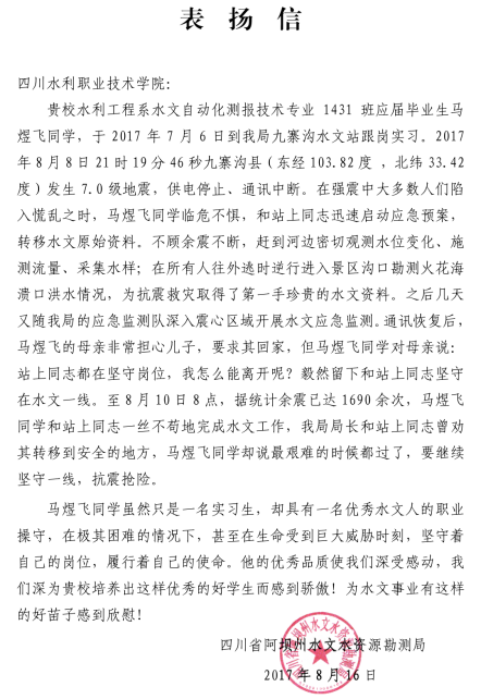 “雖然只是一名實(shí)習(xí)生,卻具有一名優(yōu)秀水文人的職業(yè)操守,甚至在生命受到巨大威脅時(shí)刻,堅(jiān)守著自己的崗位,我們深為水文事業(yè)有這樣的好苗子感到欣慰!边@封阿壩州水文局寫給學(xué)院的表?yè)P(yáng)信,被院長(zhǎng)劉建明拍成照片一直存在手機(jī)里。